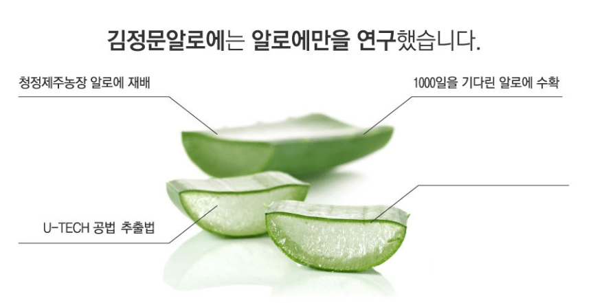 김정문알로에는 청정제주농장에서 직접 기른 알로에U-TECH 공법 추출법으로 알로에베라잎즙 원료만으로 만듭니다.