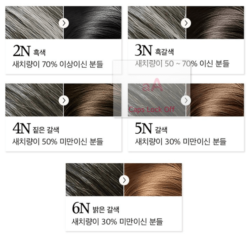 미쟝센 올뉴 쉽고 빠른 거품염색약은 새치량에 따른 염색약의 컬러도 제안하고 있습니다.