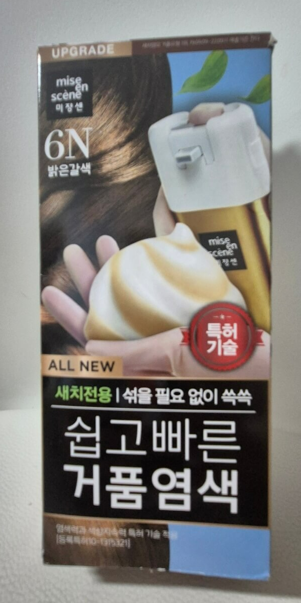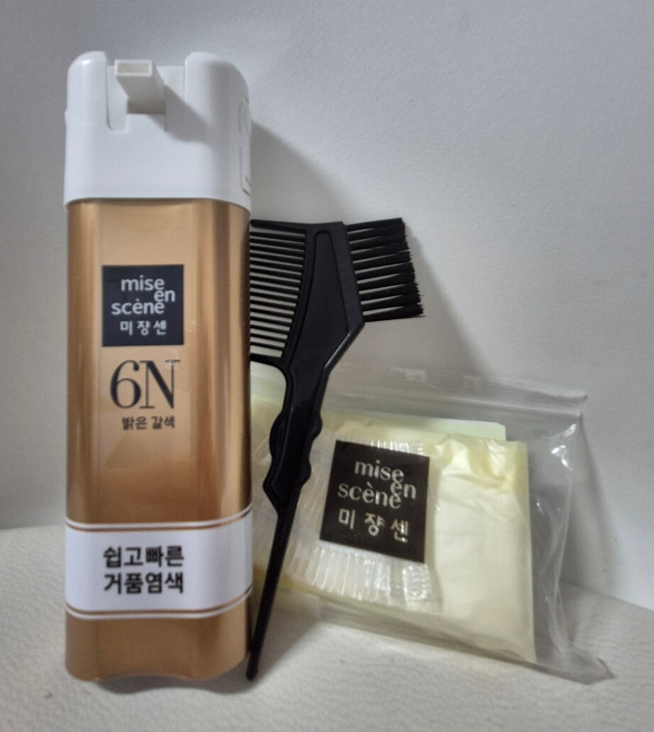 미쟝센 올뉴 쉽고 빠른 거품염색 6N 밝은 갈색입니다. 기존에는 미쟝센 헬로버블 염색약을 사용했었는데, 염색이 빨리 빠지는 것 같아서 이번에는 새치염색 전용 염색약으로 바꿔봤습니다.