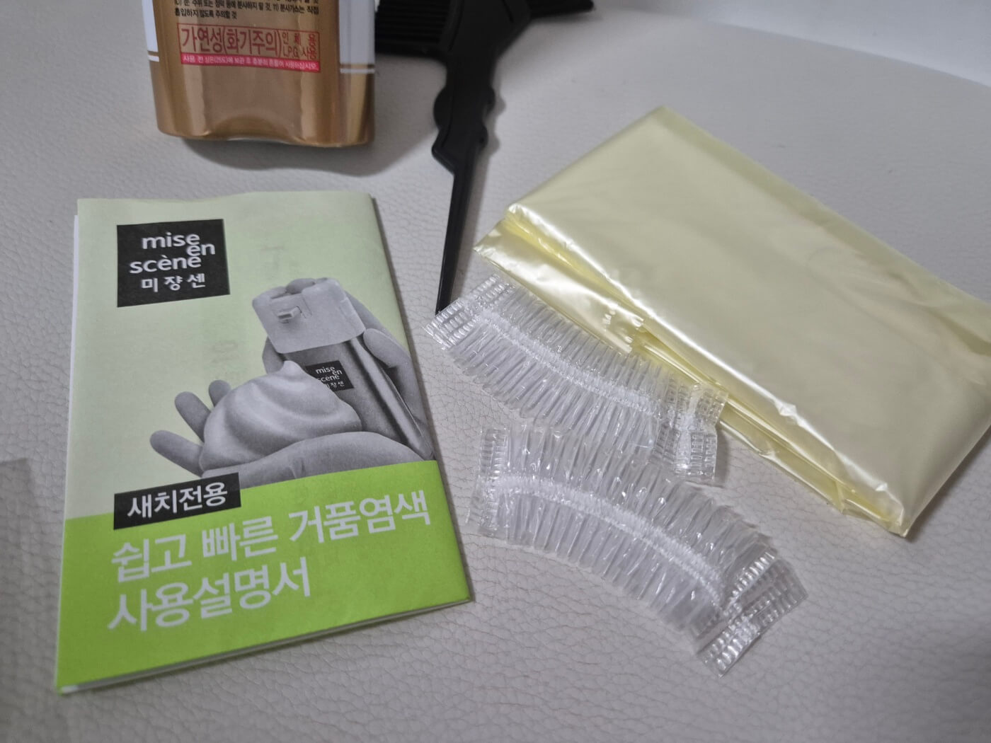 미쟝센 올뉴 쉽고 빠른 거품염색약의 구성은 타 염색약들의 구성과 비슷합니다. 다만, 차이점이라고 할 수 있는 부분은 귀커버가 추가적으로 들어있는 정도입니다.