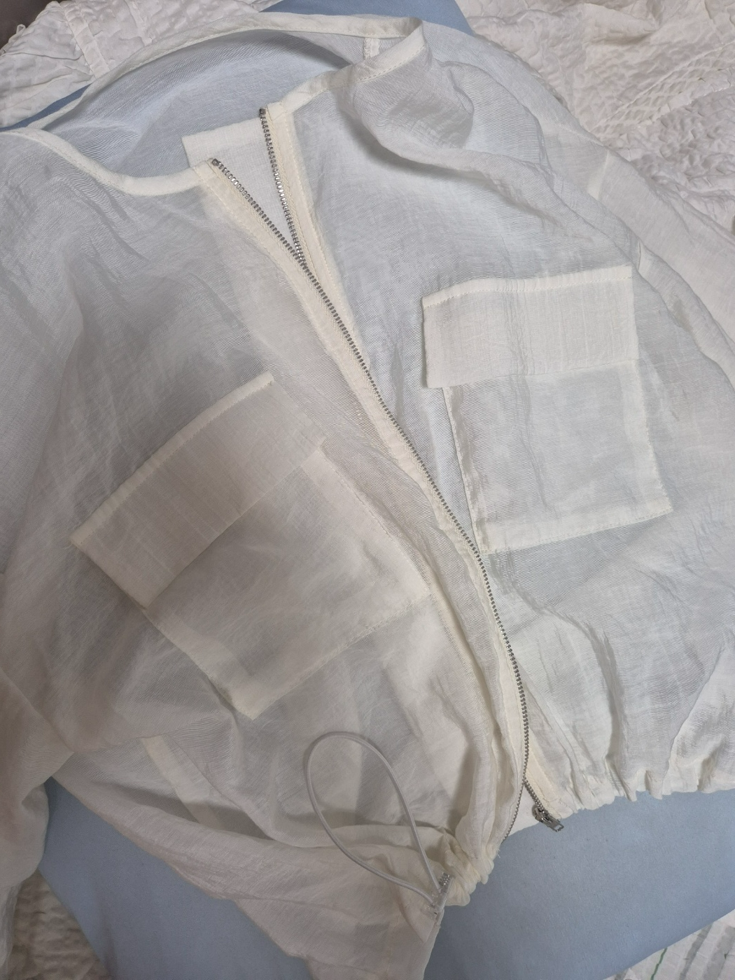 얇고 가벼운 시스루 소재의 후드 집업이에요.