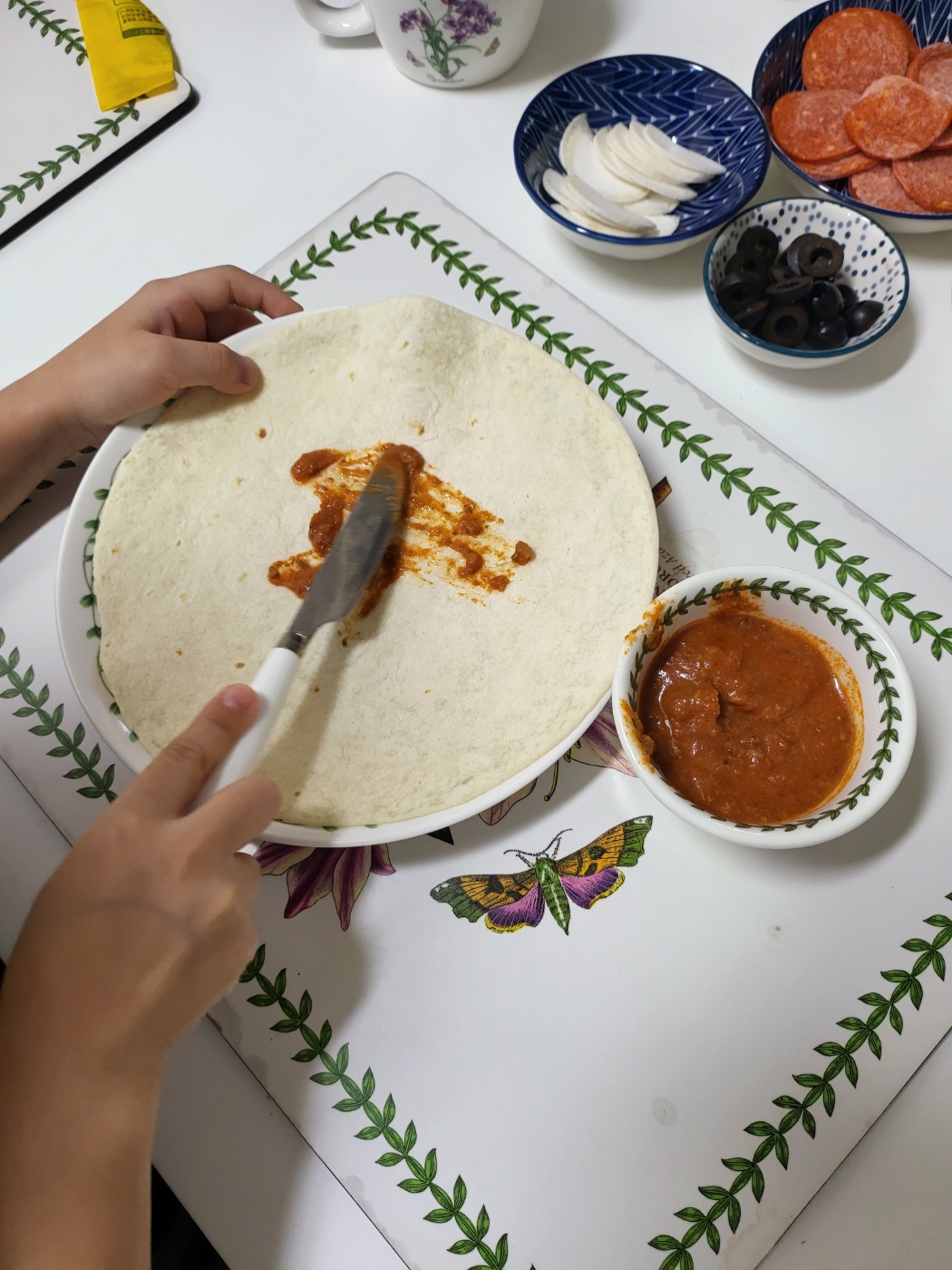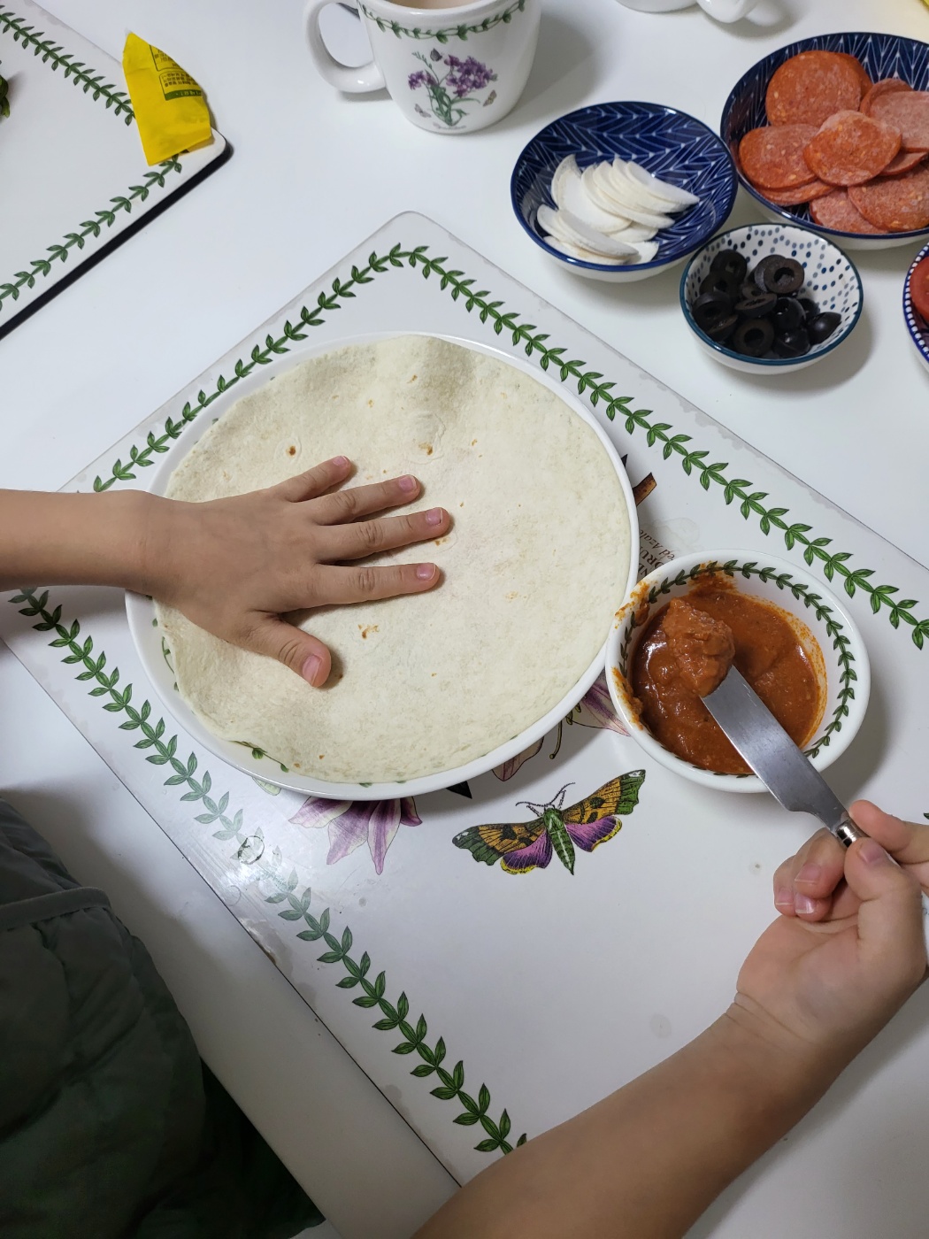 그래서 놀이도 하면서 한끼 해결하기 위해 쌀 또띠아를 이용한 홈피자 만들기를 해 보았어요.