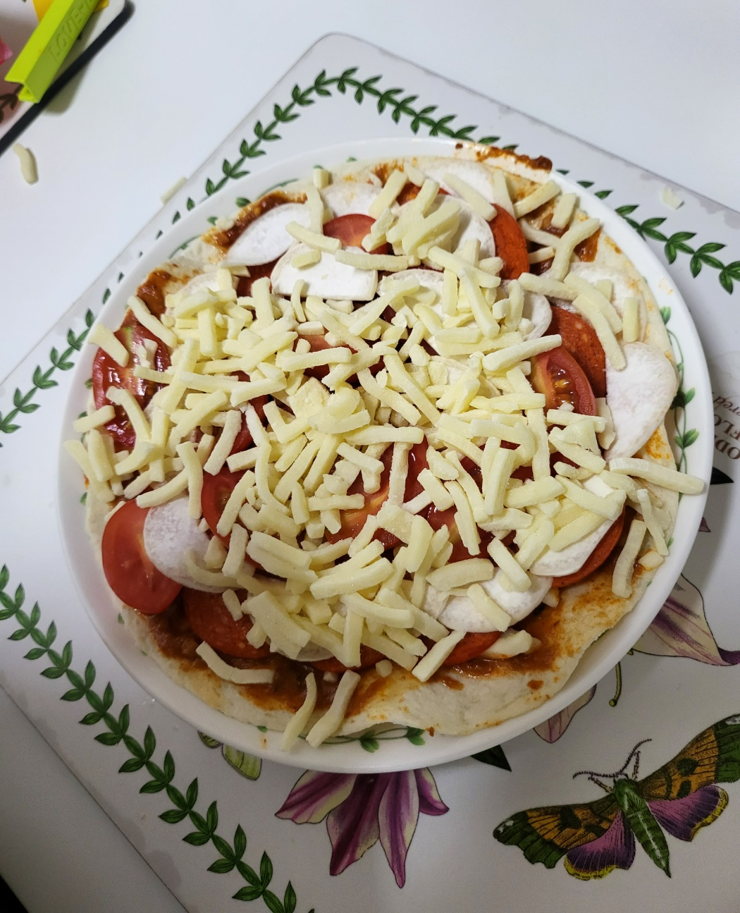 사이즈 맞는 접시에 쌀 또띠아를 피자도우 삼아 올린 후, 미트 파스타 소스를 발라줍니다.