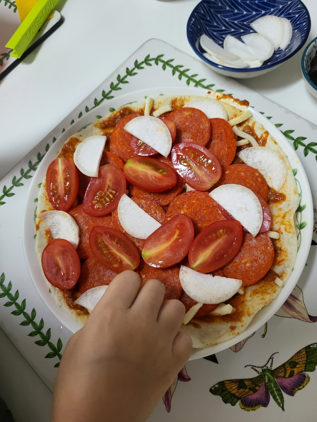 페퍼로니, 방울토마토, 버섯 등을 아이 취향에 맞게 올리고 있습니다.