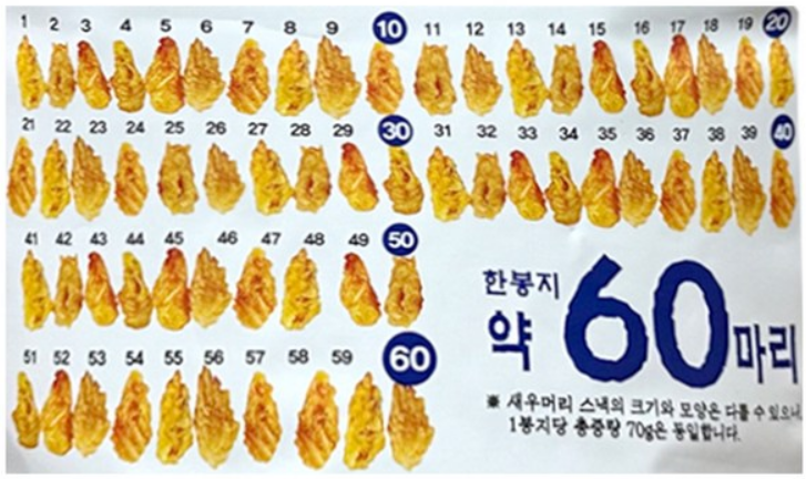 한 봉지에 약 60마리의 새우머리가 들어있어요.