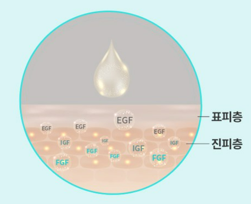 FGF는 피부 진피층에 영향을 주고, EGF는 피부 표피층에 영향을 줍니다. IGF는 FGF와 EGF를 연결해 주는 작용을 합니다.